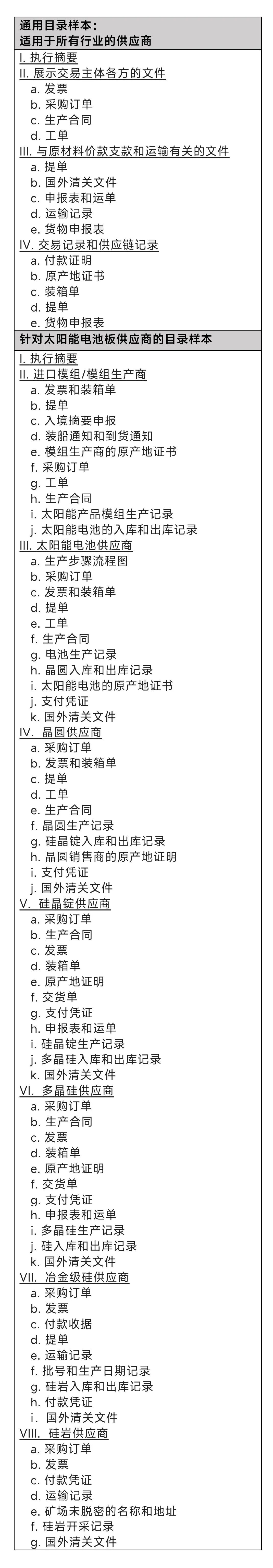 1. 太阳能电池板:进口商提供了所有交易、财务和运输文件,包括包装清单、提单、原产国证明、发票、采购订单、合同、生产记录、原料/产品清单、支付证明和运输记录,相关文件覆盖了太阳能电池板制造过程中的所有阶段,从太阳能电池板模组和太阳能电池到硅片、硅锭、多晶硅、硅和石英石。