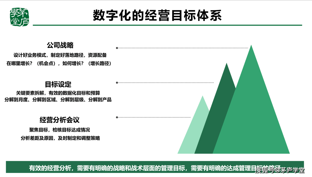 同时我们要建立起经营分析体系,利用财务、业务、客户等数据信息,对公司的经营状况进行分析,聚焦公司目标达成情况,监控战略落地过程中的问题,提炼改善方案,确保经营目标的达成。