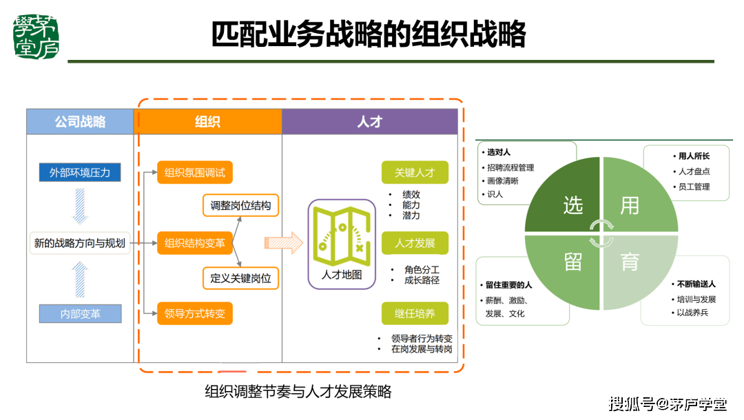 当公司业务战略因外部环境或内部变革而做出了新的战略方向与规划的时候,组织中的结构、氛围、领导方式都要发生相应的变化。现有的组织架构是否能支撑新的业务战略落地,业务价值链是否清晰,业务流是否顺畅,里面的关键岗位是否会发生变化,关键岗位的核心胜任力又会有什么变化,我们现有储备的人才是否能够满足业务发展的需求,缺失什么必须补足的关键人才,什么能力需要向外招聘,什么能力可以通过新的业务场景实战长出来,都是需要考虑的。匹配业务战略落地的组织设计,支撑业务发展的人才地图,都尤为重要。