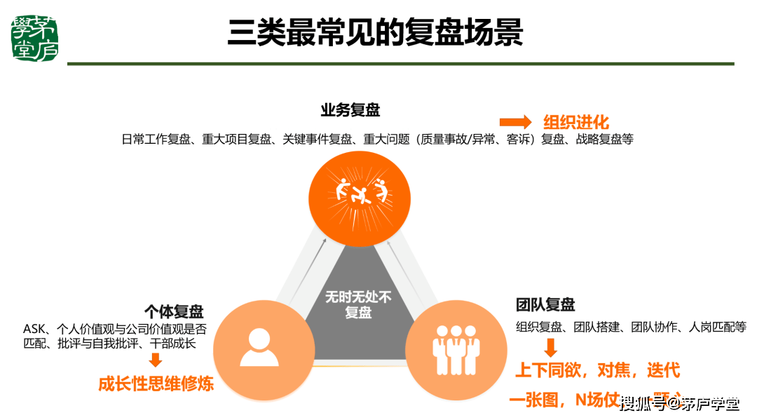 如果要做好复盘,需要有五大“复盘心态”:开放、坦诚表达、实事求是、集思广益、内向归因。复盘有三大类:业务复盘、团队复盘、个体复盘,可以在不同的阶段和场景中应用。