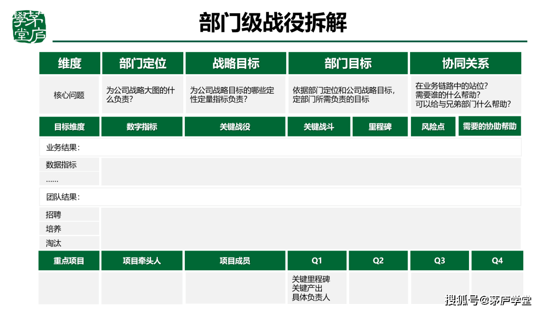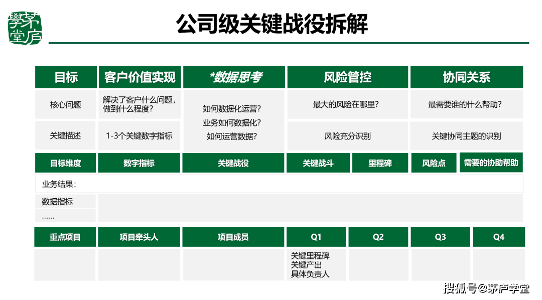 第一个拆解战役,是拆解公司级必赢战役与目标。从主要战场,必赢战役,关键战斗,协同部门,人财物需求,逐步拆解;再聚焦和提炼公司最重要突破的3-5大战役,画出业务链路,识别关键突破口,明确业务链路上各部门的站位、细化每个部门在关键战役上所需承担的产出,细化到以季度为单位的时间表上。据此,项目一号位、跨部门项目组的组建、后续业务追踪管理机制均可同步跟上。