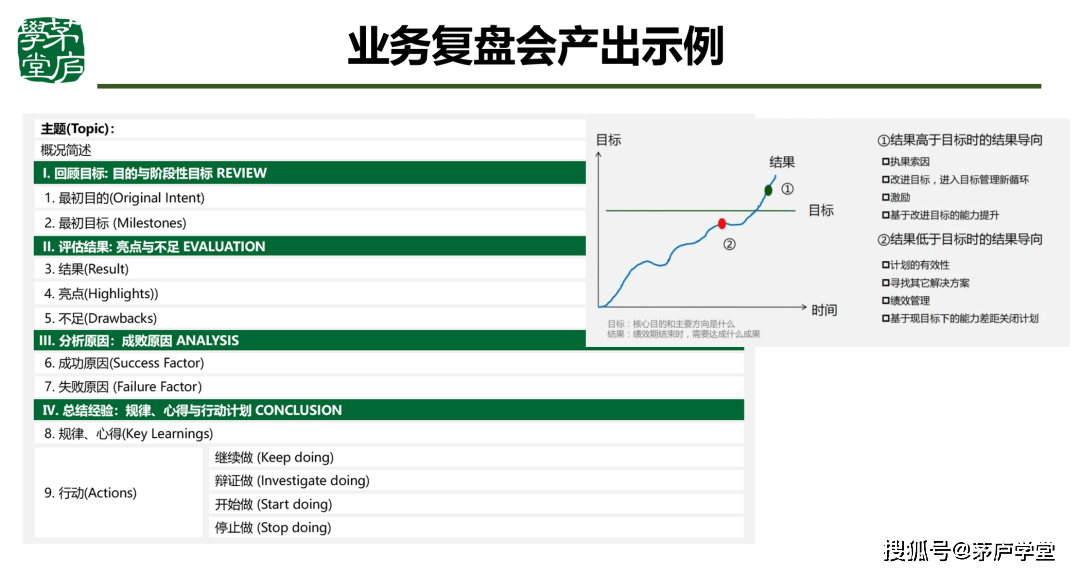 复盘是通过对过往事件的集体深入探讨和反思,从过往的经验中学习和提升的重要手段和工具。复盘会的结构一般包括回顾目标—评估结果—分析原因—总结改进。