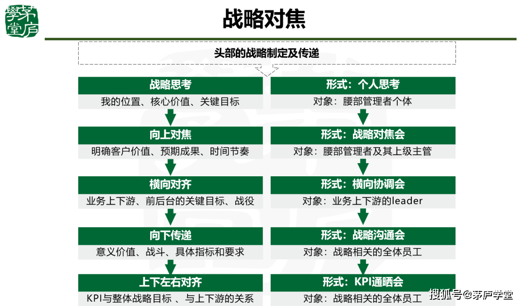 第一步,战略对焦。上下左右目标对齐,共识战略实现路径。高管共识,上下对焦;腰部清晰理解战略,左右对齐,横向拉通,清晰各自协同站位;可视化向下传递,员工清晰部门与战略、个体与整体的关联。