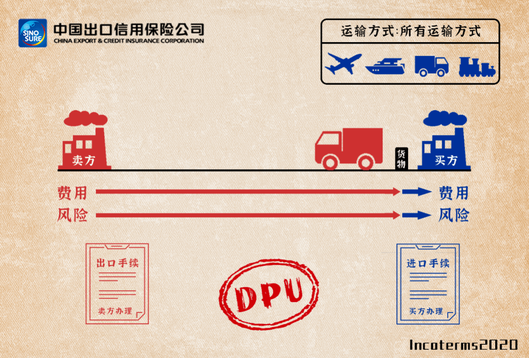 DPU全称是Delivered at Place Unloaded,中文意思是运输终端交货,是指卖方在指定目的地或目的港集散站卸货后将货物交给买方处置即完成交货,卖方承担将货物运至卖方在指定目的地或目的港集散站的一切风险和费用除进口费用外。