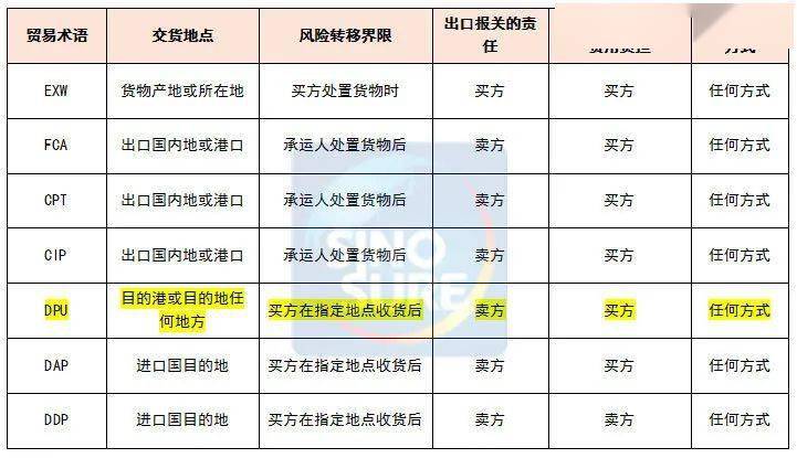 | 关于DPU | Incoterms2020中DAT改为DPU,DPU术语的交货地点仍旧是目的地,但这个目的地不再限于运输的终点,而可以是任何地方。 |