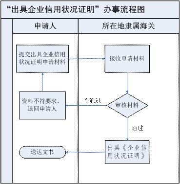 | 办理流程 | (一)申请人申请。申请人向所在地海关提交申请材料。(二)所在地海关审核。申请人提交的申请材料齐全且填写完整、规范的,予以接收;申请人提交的申请材料不齐全,或填写不完整、不规范的,退回企业。(三)所在地海关出具《企业信用状况证明》。(四)文书送达。按照送达有关规定将法律文书送达企业。 | ||